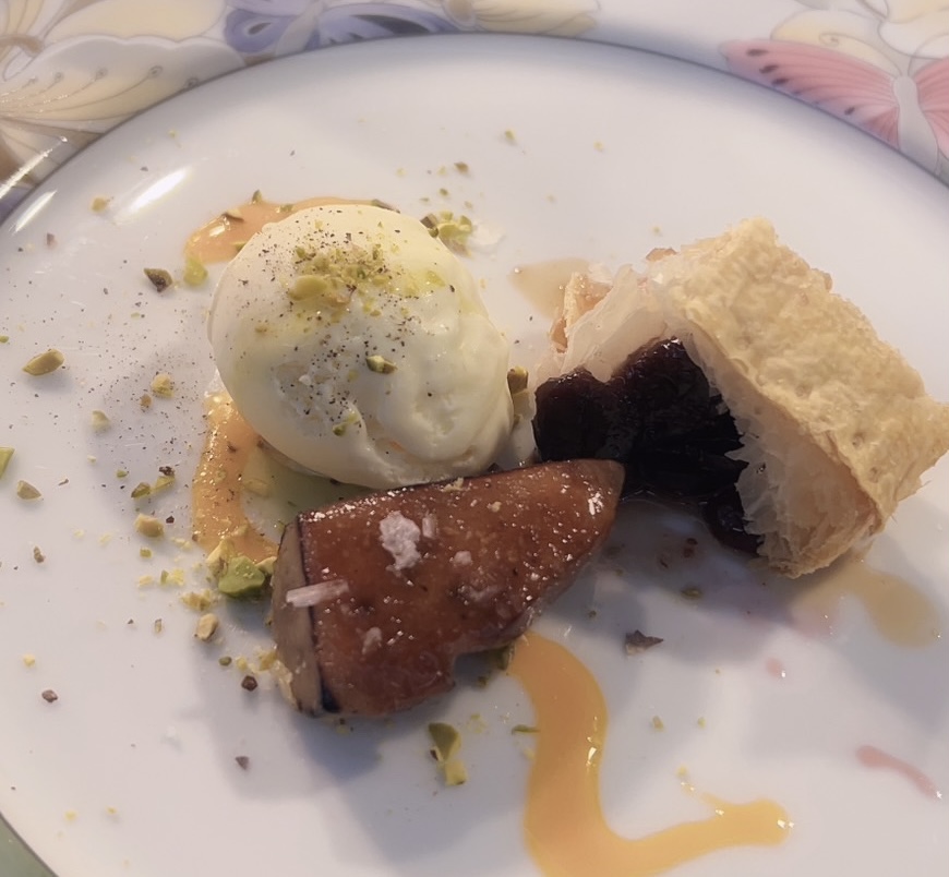 foie gras d’oie caramelise/ foie gras d’oie gelato/pistache/ canneberge